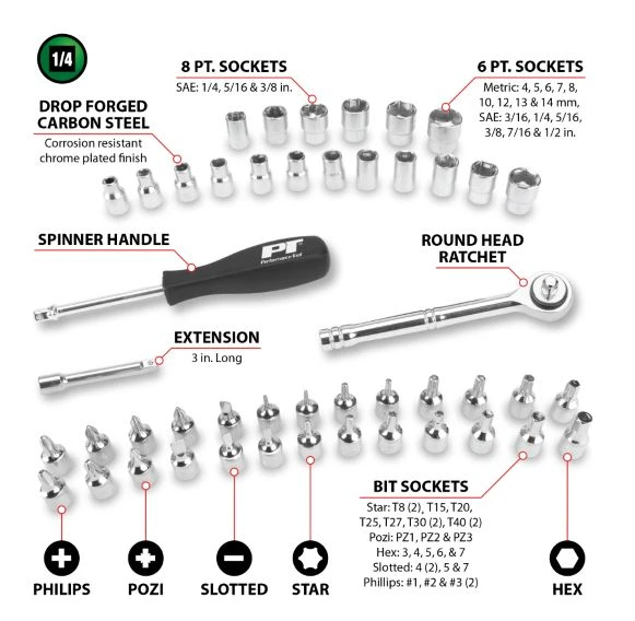 - Contents: 1/4 inch dr. round head ratchet, 1/4 inch dr. Γ 3 inch extension, 1/4 inch dr. spinner handle