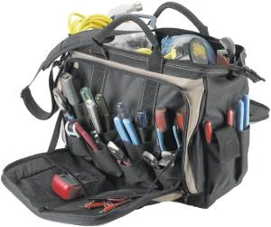 Our very popular multi-compartment tool carrier with an extra-large center compartment for power tools and two zippered side panels with multiple pockets for all your favorite hand tools, has padded handles and an adjustable shoulder strap.