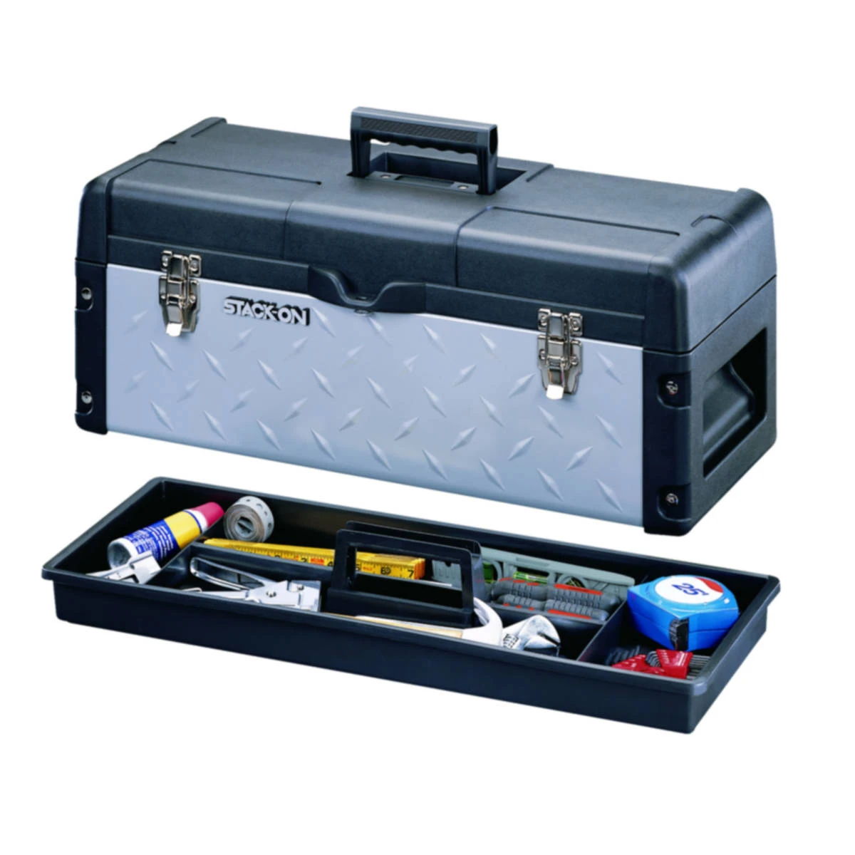 This 26 in professional multi-purpose tool box is built with features that PROs and serious DIY-ers demand. The heavy duty steel body with diamond plate accents is capped with impact resistant plastic ends that provide protection against nicks and abrasions. A full length galvanized steel hinge connects lid to the body and large nickel-plated latches are riveted in place both work hard to keep the lid and bottom from separating under heavy loads. An easy-to-grip, fold down handle is held in place with steel rivets for strength and durability. Inside, a convenient lift out tray adds additional storage and organization capabilities. Fully lockable, this toolbox also includes a padlock eye for added security.