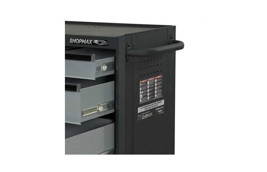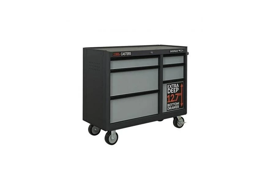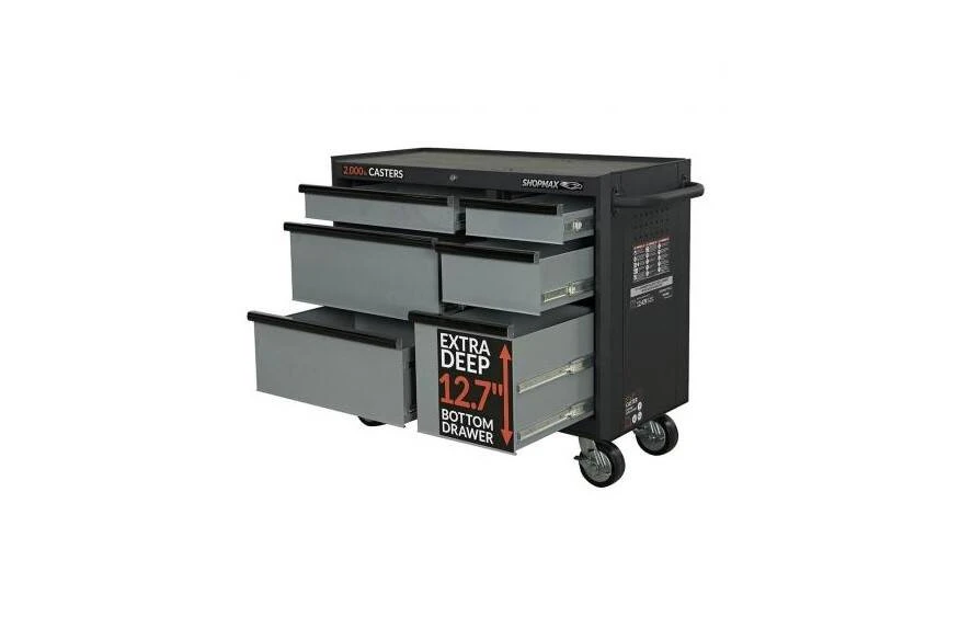 Keep your work area and your projects organized, and keep all your tools nearby, by using the rugged SHOPMAX® 6-Drawer Mobile Tool Cabinet.This cabinet has a medium footprint, but you can store up to 12,439 cu. in. within the six drawers. Each drawer is equipped with ball bearing drawer slides that have a secure latch mechanism that prevents the drawers from opening unexpectedly when moving the cabinet around your workspace. This roomy cabinet is designed for heavy usage, and features all-welded 20-gauge steel construction. Use the sturdy all-steel tubular side handle to easily move the cabinet where you need it. Holds up to 1,000 pounds of your tools and equipment, but rolls easily and safely on four heavy-duty 5″ x 2″ casters. The extra-deep bottom drawer fits larger, heavy items. And all of the bottom drawers can hold double the weight capacity, with dual drawer slides on each side. Paint is a rust-resistant composition finished with a rugged, non-scratching rough finish.