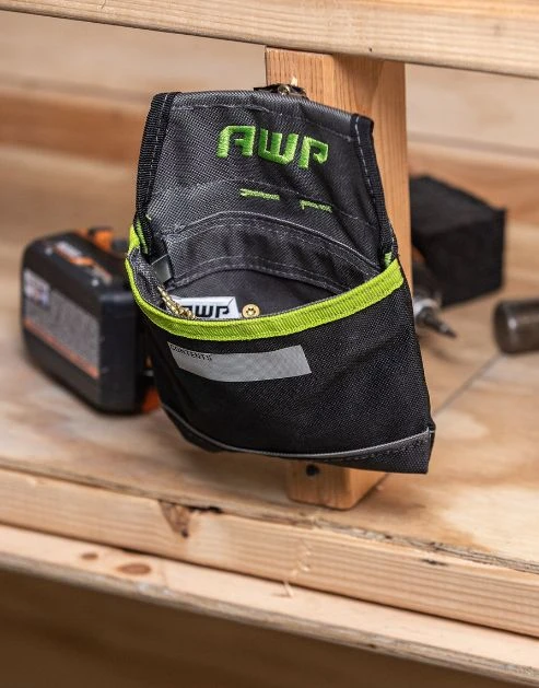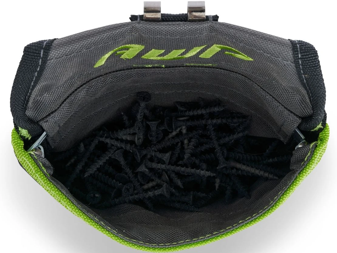 Incredibly convenient for large or small projects, the AWP Clip-On Fastener Pouch features the innovative, spring-loaded TrapJaw technology that snaps open wide to provide easy-access and snaps closed to secure small tools and fasteners inside. Constructed with water-resistant 600 denier polyester, it’s also reinforced at wear points for long-term durability. The write-on panel allows you to label contents of your pouch for easy identification. Includes a metal belt clip for easy on-and off or can be threaded on your tool belt with the tunnel loop attachment.