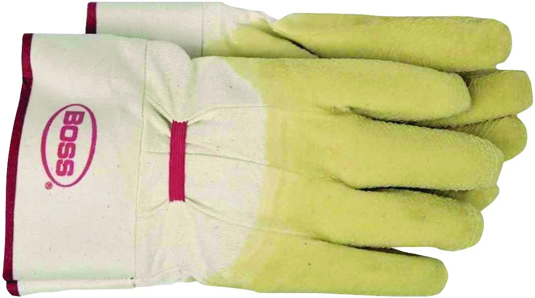 Rubber coated palm, thumb, and fingers on cotton flannel shell. Elastic strap on back and safety cuff.