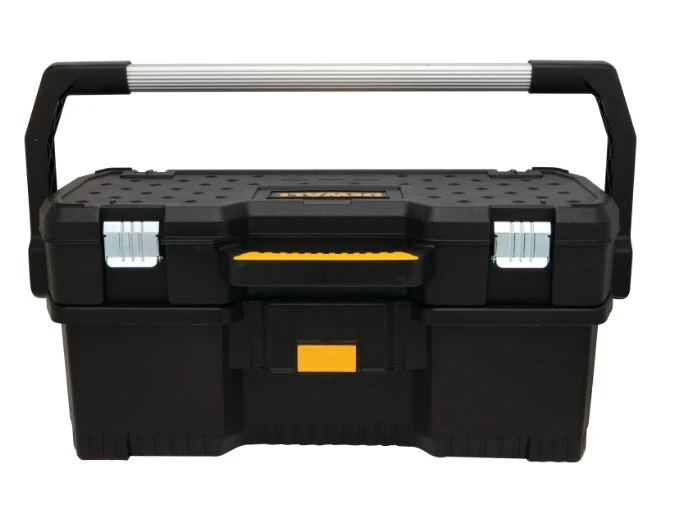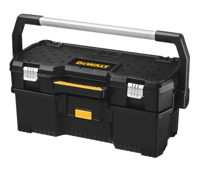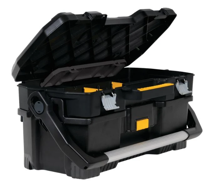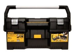 The 24-Inch Tote with Removable Power Tools Case has a top case with an integrated carry handle for power tools and small parts. It has a long metal carry handle for easy grip and carrying of the tote.