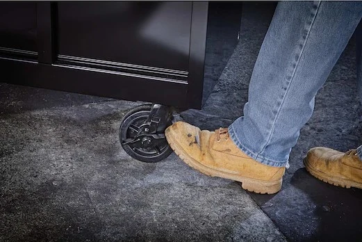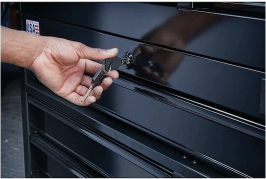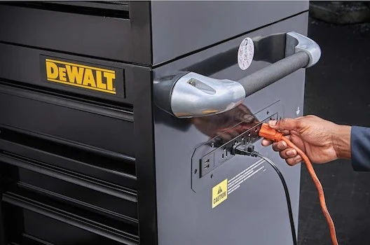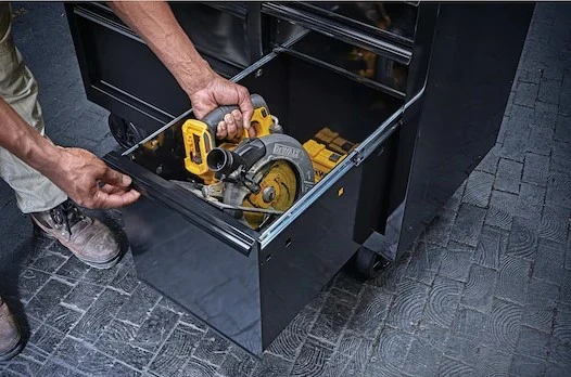 This 41-inch wide 9-Drawer Rolling Tool Cabinet is constructed of double-wall steel for strength and durability. It has nine 100-pound load capacity drawers with soft close latching for smooth and quiet operation. It also has a heavy-duty keyed internal locking system to safeguard tools. This cabinet has a load rating of 1,500 pounds with reinforced mounting channels, and it has four 5-inch x 2-inch casters, two of which lock and swivel. A full-grip tubular side handle with a comfortable black overmold is included for ease of mobility. Also included are nine DEWALT embossed drawer liners and one DEWALT embossed top mat to help protect the cabinet surface.
