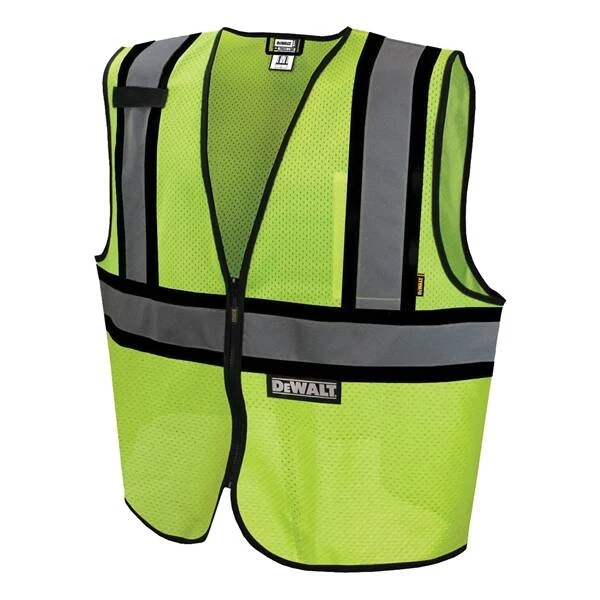 The DeWALT® DSV221 class 2 economy mesh vest with contrasting trim will help protect workers with a brand name they know and trust. The DSV221 is built with durable stitch reinforcement at major stress points providing Guaranteed Tough™ protection. The high visibility mesh material and the 2 in sewn on reflective tape with contrasting trim helps provide visibility in both bright and low light conditions.