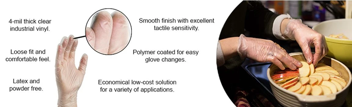 Lets say youve been searching for an all-around disposable glove thats solid enough to provide dependable barrier protection, yet economical enough for applications that warrant frequent glove changes. You want a comfortable fit, high tactile sensitivity, resistance to common chemicals and cleaning solutions. These high-value vinyl gloves are just what youve been looking for. They are well-suited for janitorial, food handling, nail & beauty, and numerous other uses.