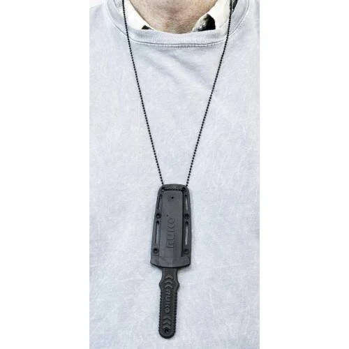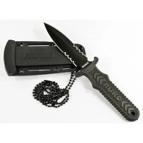 Neck/Boot Knife, black titanium nitride coated 1/3 serrated spear point blade; glass reinforced nylon handle with non-slip rubber edges; glass reinforced nylon sheath with reversible metal boot clip, black oxide finish copper neck chain, Blade: 3-inch, Overall, 6-3/8-inch.