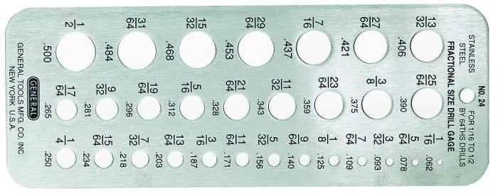 Drill Gage is a useful guide for identifying drill bit sizes; extremely helpful when working with older, unmarked drill bits, as well as with bits that are too small to fit diameter markings. Measures bits from 1/16 in to 1/2 in ; made from heavy duty stainless steel with black etched graduations.