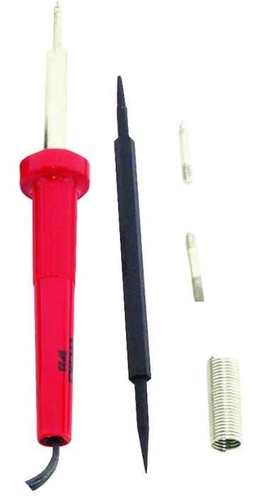 For hobbies, kits and radios. Stainless steel barrel with heat and impact resistant pencil handle. With on/off indicator light. Contains No.SP23 soldering iron, three 1/8 in diameter nickel-plated copper iron tips, lead-free solder, and soldering aid tool.Tips develop 750° Fahrenheit and include No.MT1 cone-shaped, No.MT2 screwdriver, and No.MT3 chisel tips. Helpful hints and instructions on card. 8-1/4 in L, 120 Volts, 25 watts, 50/60 Hz. U.L. Listed.